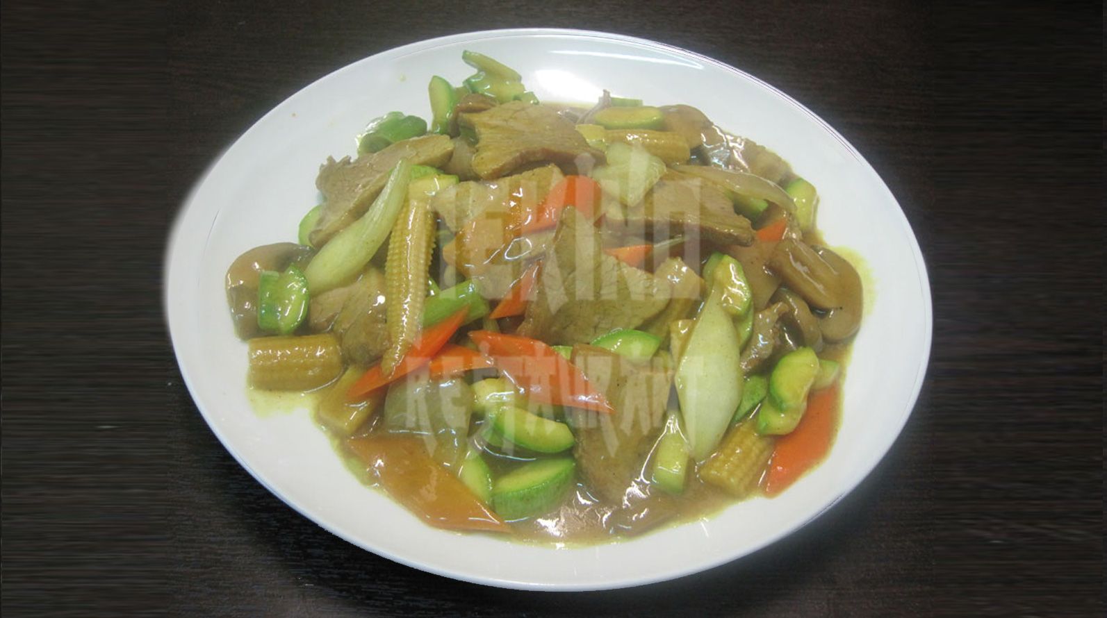 Με μανιτάρια, κολοκύθι, κρεμμύδι, καρότο, baby corn και κάρυ
