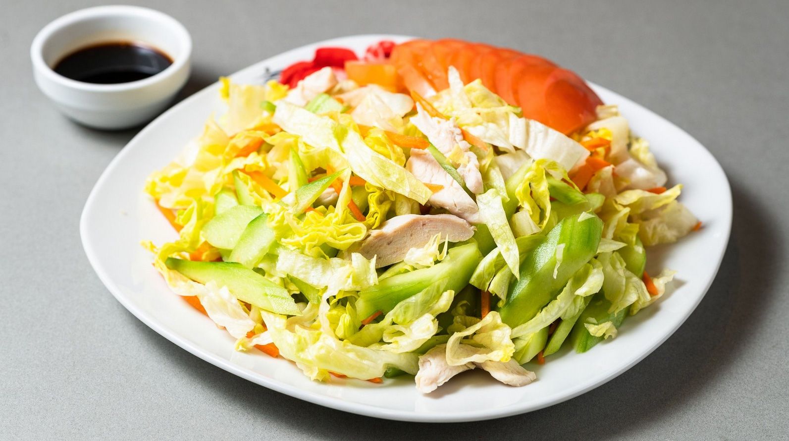 Σαλάτα με μαρούλι iceberg, αγγούρι, κρεμμύδι, καρότο, κοτόπουλο και ντομάτα. Συνοδεύεται από σόγια σως